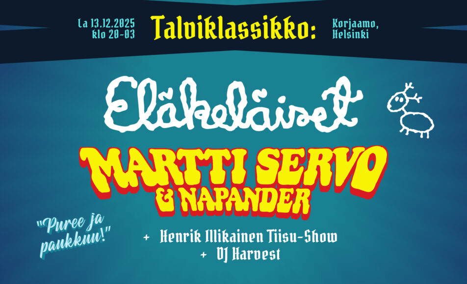 Talviklassikko – puree ja paukkuu! La 13.12.2025 Vaunusali Liput: ennakkoon 37,6 € / ovelta mikäli jäljellä 39 € 20:00 ovet 20:00 Henrik Illikainen Tiisu-Show 21:00 Martti Servo & Napander 22:45 Eläkeläiset 23:45-02:30 DJ Harvest K18 Klo 23.45 jälkeen sisään jatkoille...