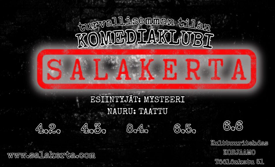 Ke 4.2.2026, ke 4.3.2026, ke 8.4.2026, ke 6.5.2026 & ke 6.6.2026 Kulmasali, Korjaamo Liput: norm. lippu 20 € / alelippu (opiskelijat, eläkeläiset, työttömät yms.) 15 € Ovet auki 18:30 Ilta alkaa 19:00 (n. 20:00 väliaika 20 min) Ilta päättyy n....