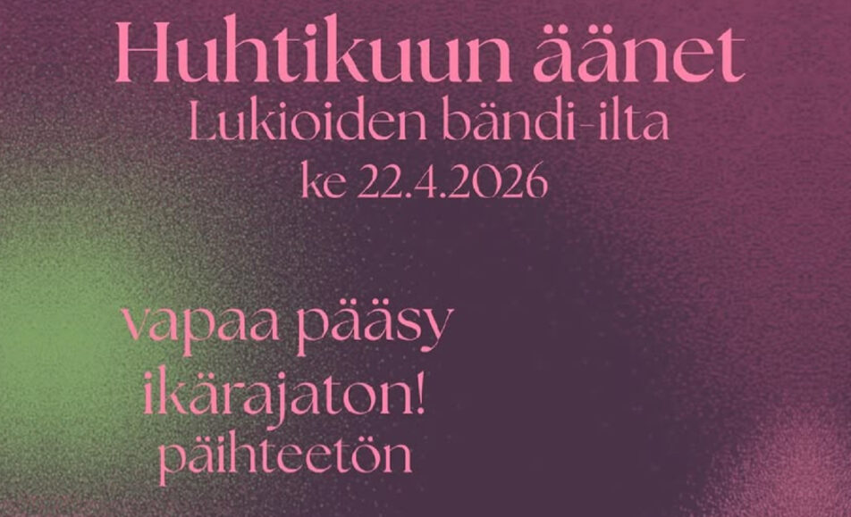 Ke 22.4.2026 Kulmasali, Korjaamo Ovet klo 18 Eka esiintyjä 18.30 Vapaa pääsy Ikärajaton ja päihteetön Esteetön Huhtikuun Äänet on vuoden sykähdyttävin soittotempaus, joka järjestetään Kulttuuritehdas Korjaamolla kaupungin melskeen keskellä! Lavalle nousevat huikeat Alppilan, Vuosaaren, Konepajan sekä Vaskivuoren lukion bändit. Sisäänpääsy...