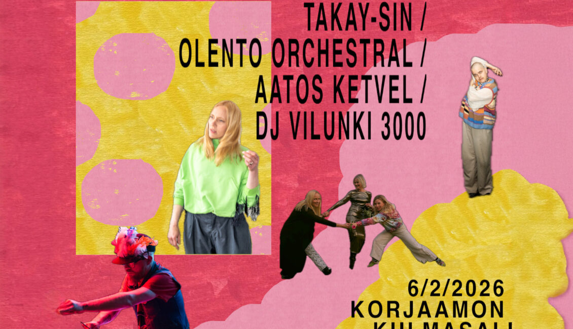 Takay-Sinin tiivistunnelmaiset kappaleet maalaavat kuvia, joissa olemassaolon pienuus ja suuruus kietoutuvat yhteen. Takay-Sin on kuvataiteilija-lauluntekijä Tellervo Kalleisen uusi sooloprojekti. Lavalla maagista ja särmikästä sävelmaailmaa loihtii Kalleisen rinnalla ainakin Saara Viika, Sirja Puurtinen ja Milla Viljamaa. Keikalla juhlistetaan Takay-Sinin debyytti-EP:tä Silmänkorkeudelta (Minna Records, 2025).